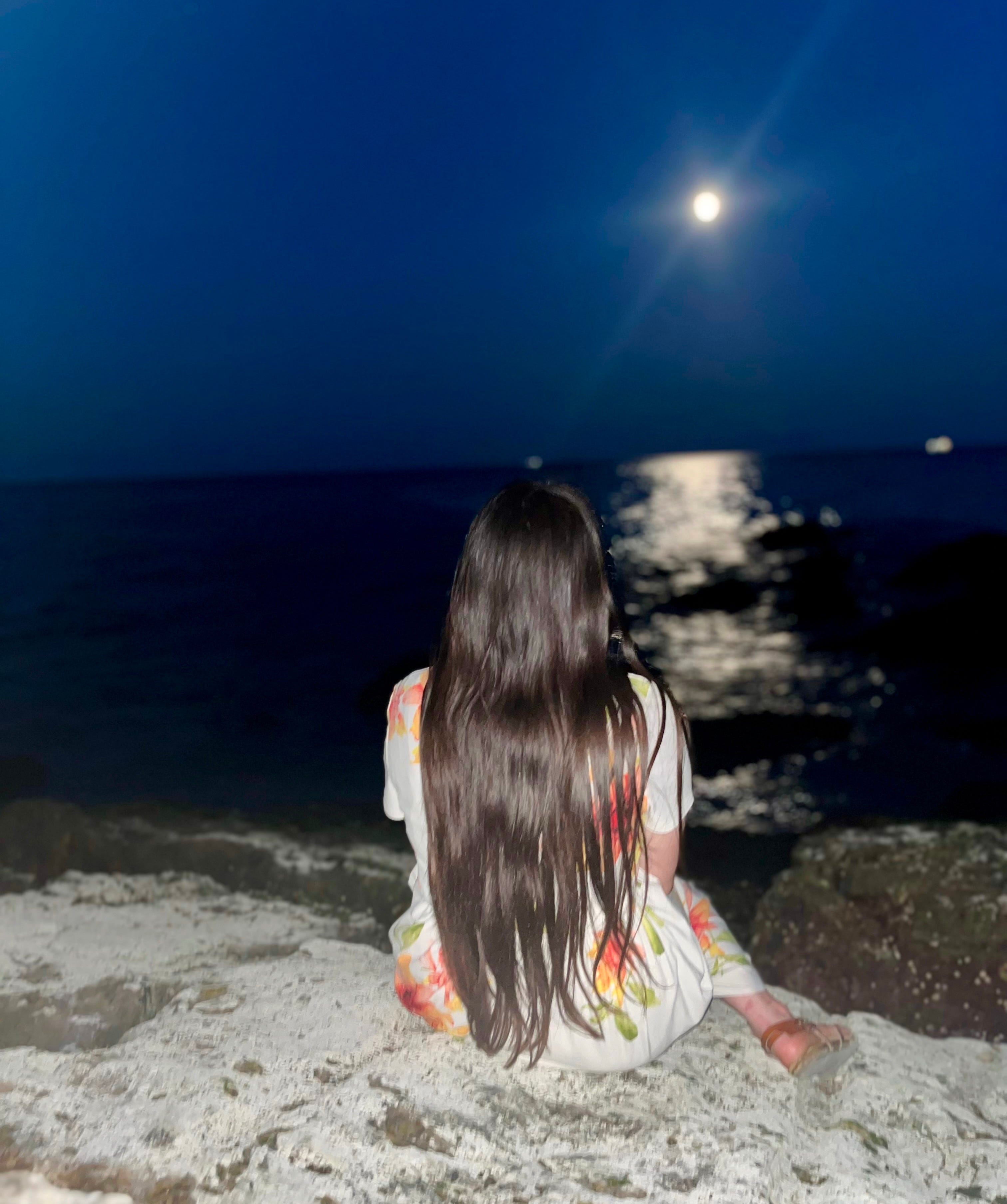 One evening, from the house porch, I saw the moon, giant and orange, rising over the ocean. My sister and I ran out, following its light down the road and onto the beach. I went up to the waves, skipping past the tide pools, and stared at that beautiful moon hanging right above my ocean, leaving a shimmering path of moonshine that stretched out to sea.